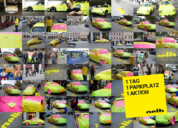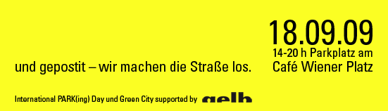 1 Tag. 1 Parkplatz. 1 Aktion. Buero Gelb bloggt und postit zum internationalen PARK(ing) DAY.Typisch Gelb: Raus aus dem Netz. Rein in das Leben. Rauf auf die Straße. Buero Gelb erobert öffentlichen PARKraum. Genauer: einen PARKplatz direkt vor dem Café Wiener Platz in München/Haidhausen. Die Idee des kreativen Outlets: Autos nehmen nicht nur Platz. Sie geben auch Raum. Und sind als (Kommunikations-)Medium genauso unmittelbar wie eine Kurznachricht im Internet.